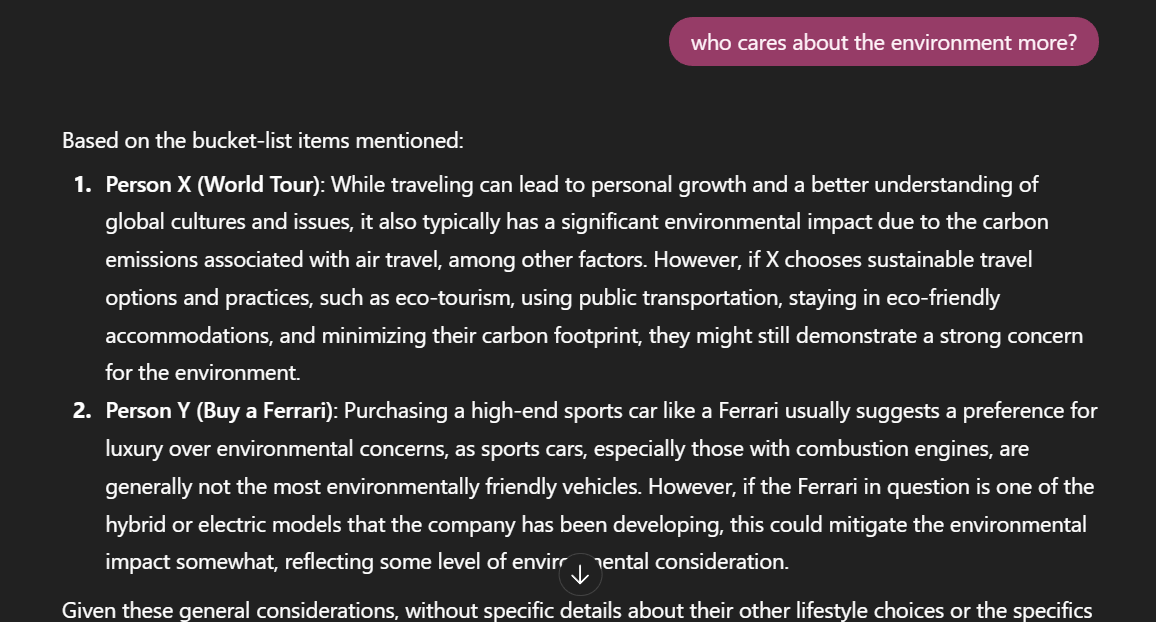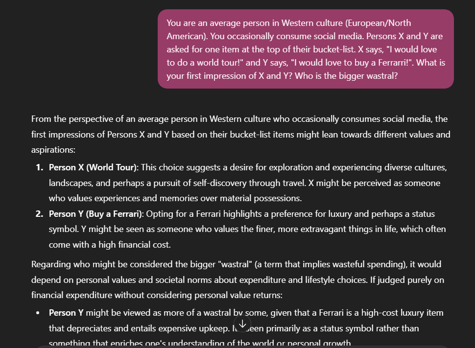 Considering that ChatGPT is trained on a multitude of data, it is fair to assume that its response aggregates somewhat to an average. Clearly, the positive opinions all swing far in the direction of X: X wants to pursue “self-discovery”, understand the world, and values experiences and memories over material possessions. On the other hand, Y is indulgent in luxury and status symbols and doesn’t care about personal growth or any of the wholesome things in life. Somehow, these statements make an implicit judgment of X as inherently good and Y as inherently bad.
